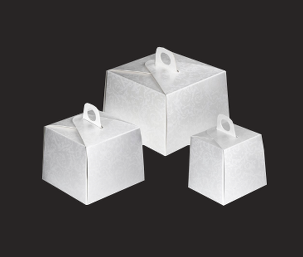 Ideale per contenere dolci monoporzione e torte di piccole dimensioni. Interno alimentare neutro. Comoda maniglia per il trasporto. Ogni confezione contiene 100 pezzi.